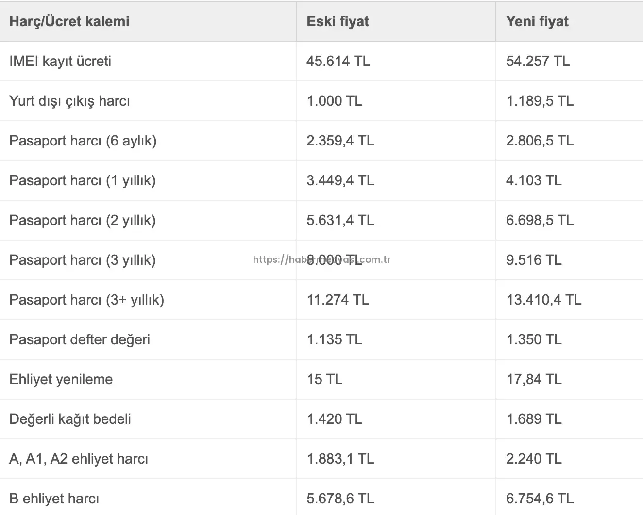 2026 yılında vergi ve harçlara uygulanacak yüzde 18,95’lik zam oranı, önceki açıklanan yeniden değerleme oranına kıyasla daha düşük tutuldu. Ancak IMEI, pasaport, ehliyet ve yurt dışı çıkış harcı gibi temel kalemlerdeki artışlar, vatandaşların bütçesini etkilemeye devam edecek. Güncel tutarlar, işlemler öncesinde mutlaka resmi kaynaklardan kontrol edilmeli.